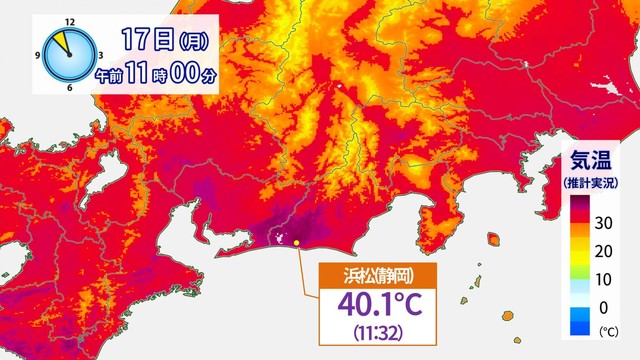 17日(月)も日本列島各地は晴れて、朝から速いペースで気温があがり、浜松では午前11時半過ぎに40.1℃を観測。