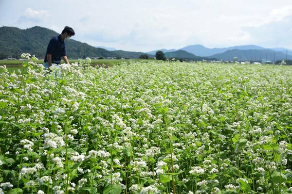 滋賀県内有数のそばの産地・多賀町で、かれんなソバの花が咲き誇っている。小さな白い花と緑の葉が秋の風にそよぎ、観光客を楽しませている。