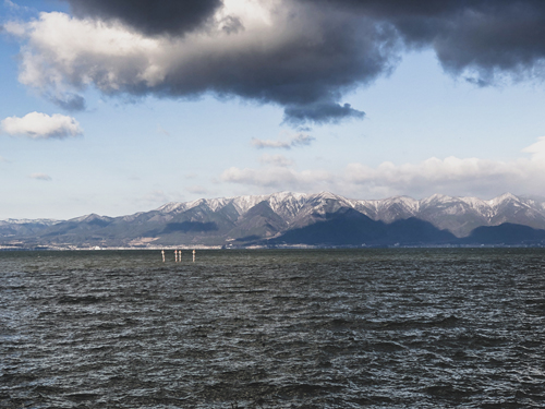 本日29日の8時過ぎ、北湖東岸ロックエリアの様子を見てきました。現地に着いたタイミングでは風は強かったものの爆風レベルでは無かったですが、徐々に強くなって白波も・・・湖岸道路に積雪はありませんが所々にある水溜まりは凍っていました。