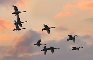 長浜で「冬の使者」コハクチョウ、夕闇に羽ばたく