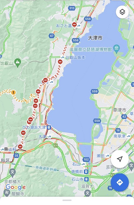 8/15(日)国道161号 西大津バイパスの京都東~雄琴間で土砂崩れがおこり通行止めされているようです。