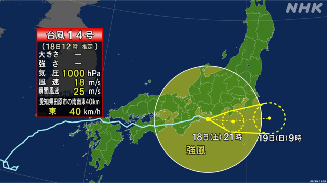 気象庁によると、台風14号は18日午後にも温帯低気圧に変わる見込みとなっています。引き続き土砂災害や低い土地の浸水、川の増水に警戒するよう呼びかけられています。