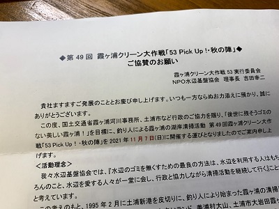 もうすぐ霞ヶ浦クリーン大作戦「53 Pick Up!・秋の陣」開催とのことでご案内を頂きましたので、協賛品をお送りさせていただきました。