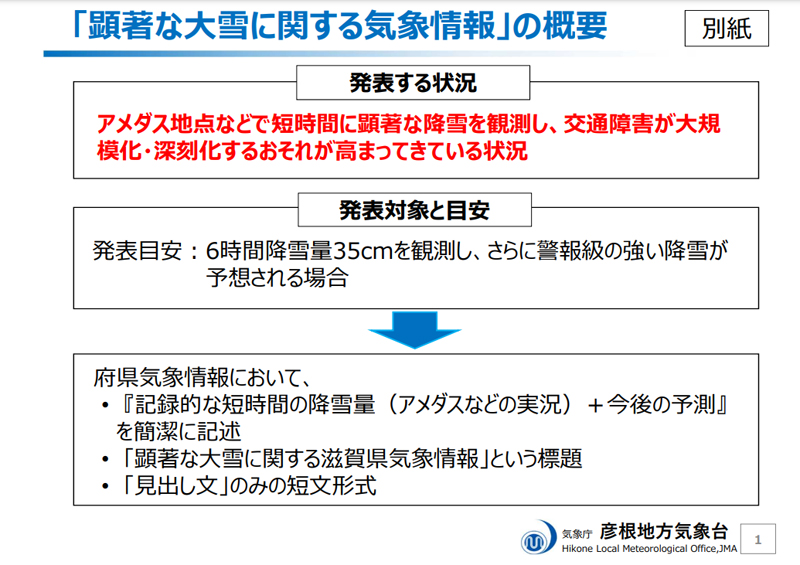 滋賀県(北部)を対象に、短時間に顕著な降雪が観測され、その後も強い降雪が続くと見込まれる場合に、短時間の大雪に対して一層の警戒を呼びかける「顕著な大雪に関する気象情報」の運用を令和 3 年 12 月 1 日から開始します。