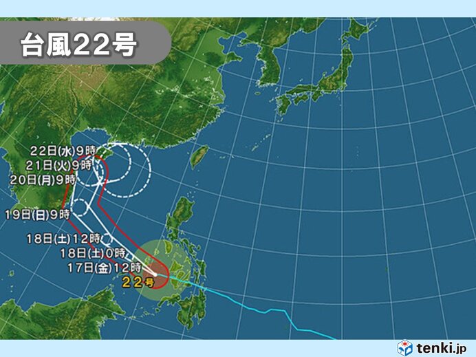 台風22号は12月16日フィリピンを通過。17日12時現在、フィリピン・ミンダナオ島の西にある、スル海を西に進んでいます。今後は南シナ海を北上し、22日には熱帯低気圧に変わる見込みです。日本への影響はない見込み。