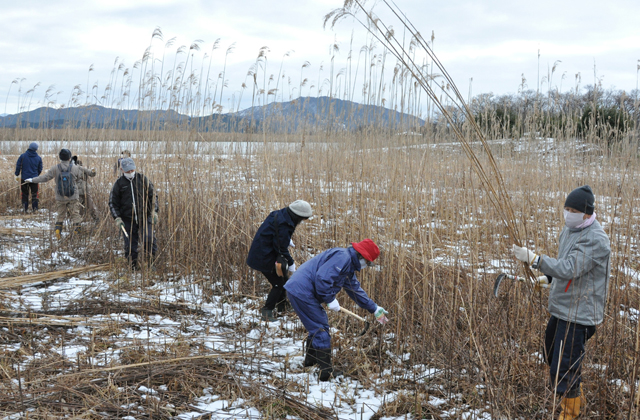 当日は、よし原に積雪が残り、冷たい季節風が吹く中で刈り取りが行われ、参加者らは、よしの役割や植生などを学びながら作業に取り組んだ。よし刈りは、2月10日と3月10日も行われ、3月末にはよし焼きが行われ、水郷に早春の訪れを告げる風物詩が見られる。