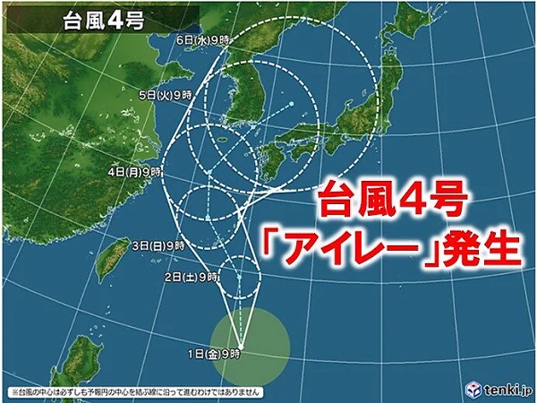 1日(金)午前9時、日本の南で台風4号「アイレー」が発生、北よりに進む見通しです。
