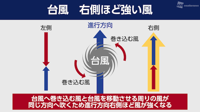 一方、左側は台風を動かす風の向きと、中心に向かって吹き込む風の向きが異なるため、互いに打ち消し合い、勢力は右側ほど強くはありません。