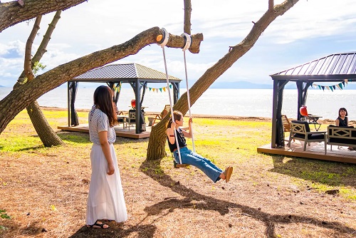 「琵琶湖」の「波・風・景色」に触れる絶景スポット!神明浜に今話題の「SUPやテントサウナ」が楽しめるビーチリゾート「OUMI WAVE」が7月9日(土)にオープン!今年は新たにキャンプ宿泊もスタート!
