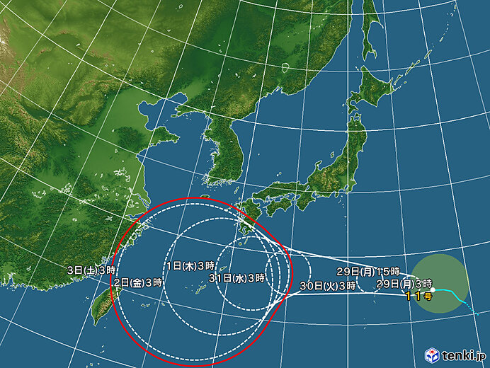 1日3時には日本の南に達し、3日3時には沖縄本島近海に達する見込み。