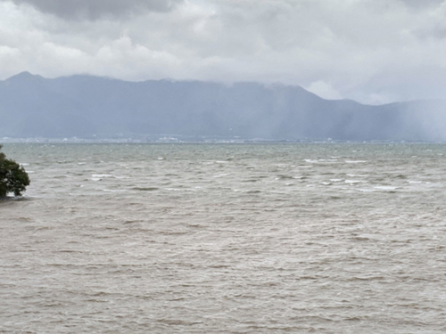 6時30分、北湖東岸日野川河口は北寄りの強風で荒れています。予報によると今日は終日北寄りの風が強く吹くようなので、ボート釣りをされる方はご注意下さい。