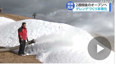 標高およそ700メートルの山にある滋賀県高島市の「箱館山スキー場」では2週間後のオープンに向けて、いまゲレンデづくりが本格化していて、10日は4台の機械を使って人工の雪をまき、斜面に高さ3メートルほどの雪の山をつくっていました。