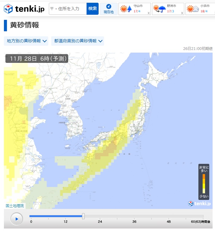 天気予報を見てみると今夜から明日にかけて黄砂の飛来が多くなるようです。