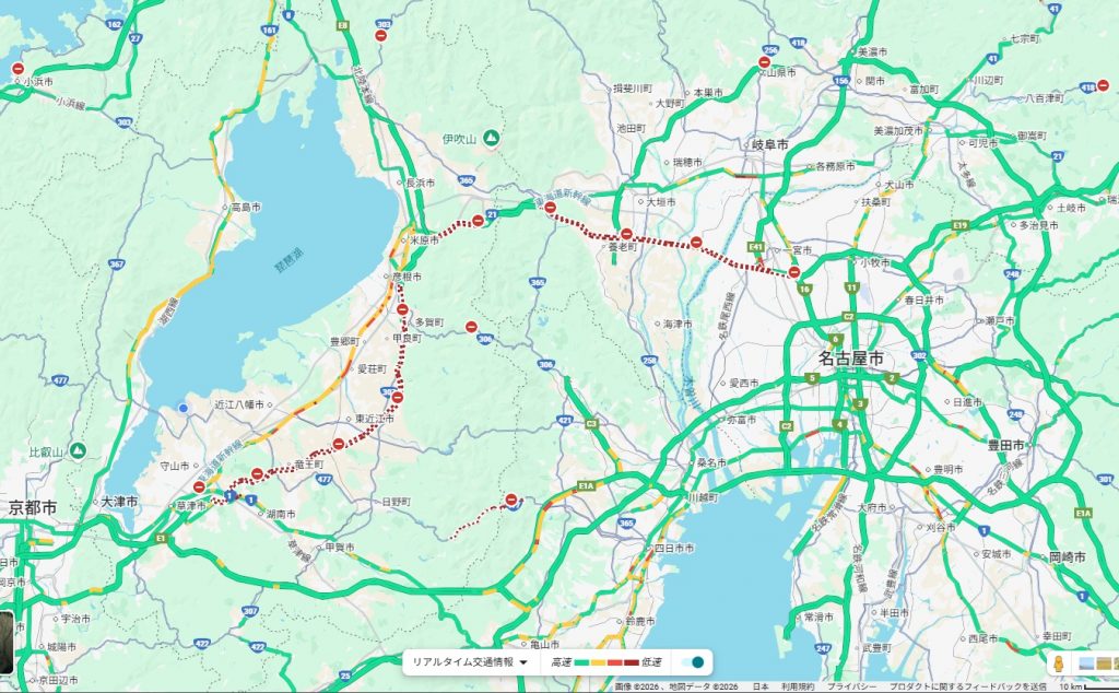 名神高速道路の栗東(滋賀)~一宮(愛知)が通行止めになっています。