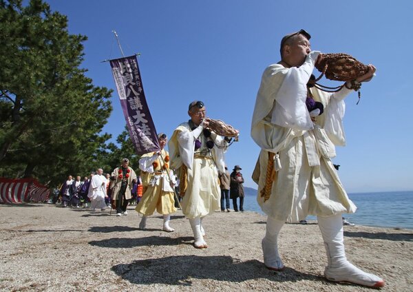 湖国に春の訪れを告げる恒例行事「比良八講」が26日、南小松の雄松崎一帯で行われた。山伏や僧侶らが琵琶湖岸で法要を営み、湖上交通の安全や湖水の浄化とともに、新型コロナウイルス感染の一刻も早い終息を願った。