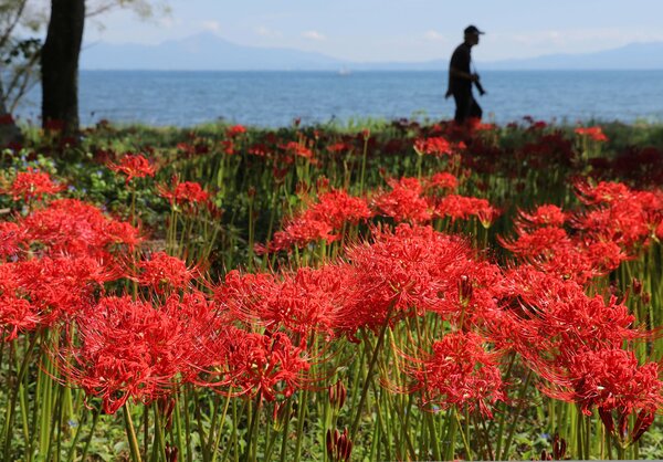 滋賀県高島市新旭町の源氏浜で、ヒガンバナが咲き誇っている。琵琶湖や伊吹山を背景に真っ赤な花が湖岸を彩り、訪れた人たちの目を楽しませている。